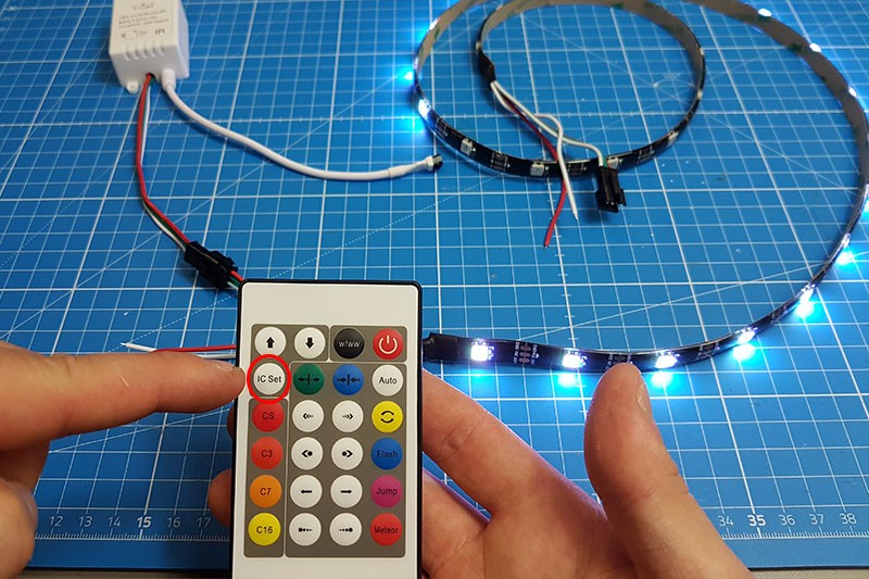 Le contrôleur LED digital ne peut pas deviner combien de Pixel/Led il y a à piloter, c'est pourquoi il faut lui indiquer afin que les animations démarrent bien au début du ruban LED et se terminent à la fin. Pour cela vous devez appuyer dans un premier temps sur le bouton "IC Set", une fois dans le réglage du nombre de pixel le ruban LED va s'éclairer en blanc. A partir de maintenant vous devez ajouter ou enlever des pixels avec les flèches qui se trouvent juste au dessus du bouton "IC Set" sur la télécommande.