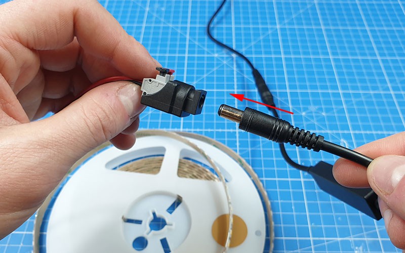 Pour le branchement, il faut que votre bande LED soit équipée d'un connecteur jack femelle. Si elle n'a que des fils dénudés, vous pouvez ajouter un connecteur jack femelle qui se raccorde sur les fils dénudés.
