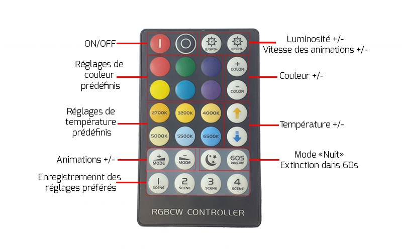 La télécommande vous permet donc de piloter le mini contrôleur RGB pour ruban LED blanc variable.