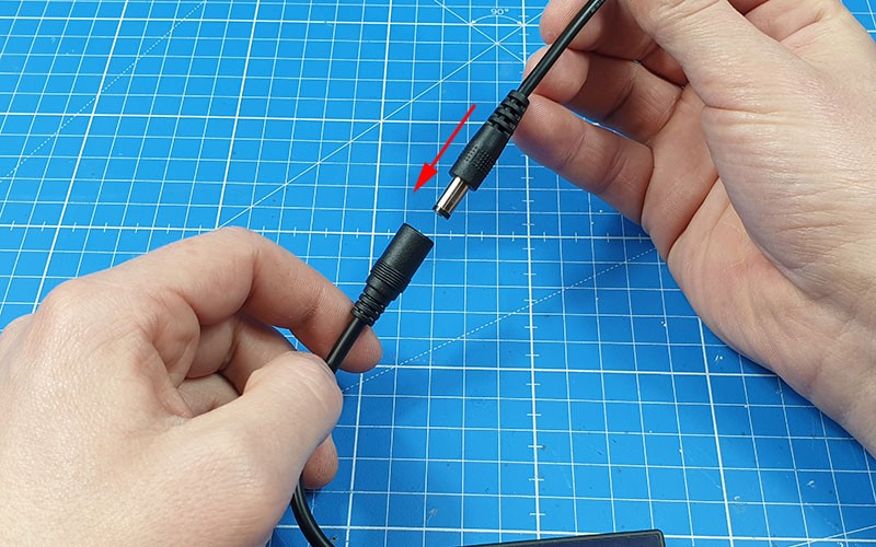 Pour le branchement, il faut que votre alimentation soit équipée d'un connecteur jack mâle. Si elle n'a que des fils dénudés, vous pouvez ajouter un connecteur jack mâle qui se raccorde sur les fils dénudés.
