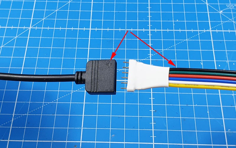Il vous suffit simplement de brancher le connecteur du ruban LED dans le connecteur du contrôleur, en prenant garde de bien faire correspondre la petite flèche (sur le connecteur du contrôleur) avec la petite flèche qui se trouve sur le connecteur du ruban LED. Si le connecteur de votre ruban LED n'a pas de flèche, il faut faire correspondre avec le fil noir du connecteur.