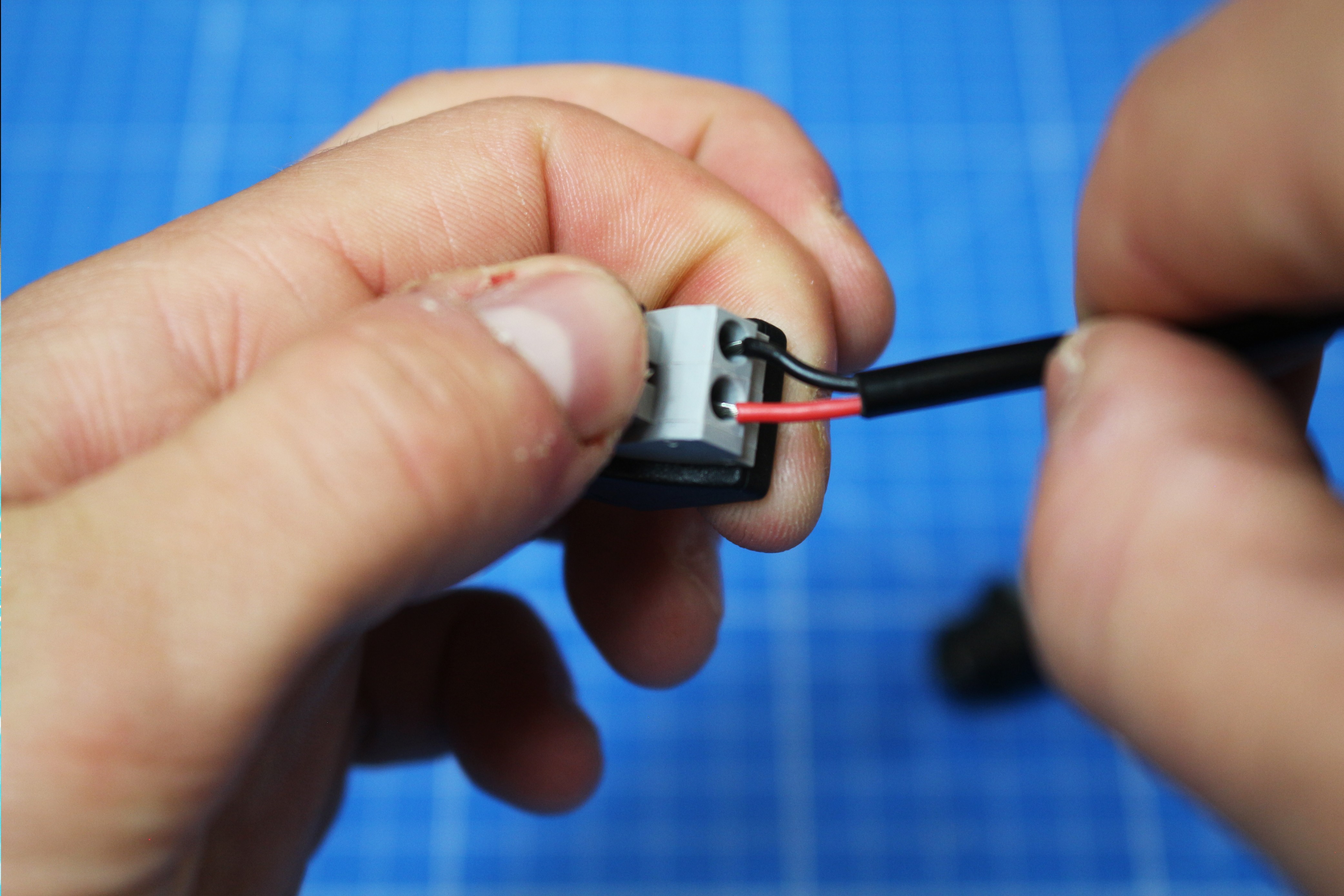 une fois que vous avez repérés les polarités, insérer les fils dénudés dans les emplacements correspondants puis appuyez sur les boutons afin d'ouvrir le système de guillotine.
